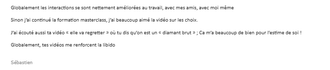 (Attention, ce n’est pas une formation orientée “techniques de drague” puisque j’avais déjà tout donné dans la formation Cyprine pour les hommes et dans l’Académie de la séduction pour les femmes (ainsi que la formation Infopreneur Content pour l’argent). Là, je veux vraiment faire une formation ULTIME pour passer au niveau supérieur !